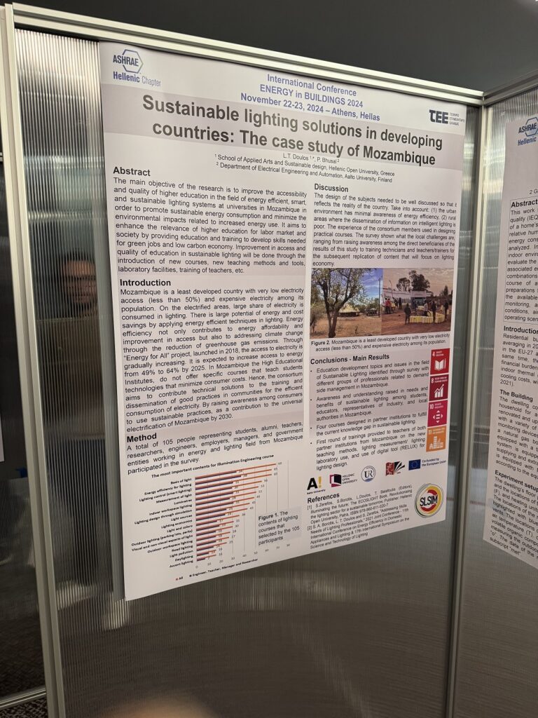 The SLSIM poster presented the 1st year of project activities and results including a) the method and the results of the survey held in Mozambique, b) the awareness and understanding raised in needs and benefits of sustainable lighting among students, educators, representatives of Industry, and local authorities in Mozambique and c) the courses designed in partner institutions to fulfill the current knowledge gap in sustainable lighting.